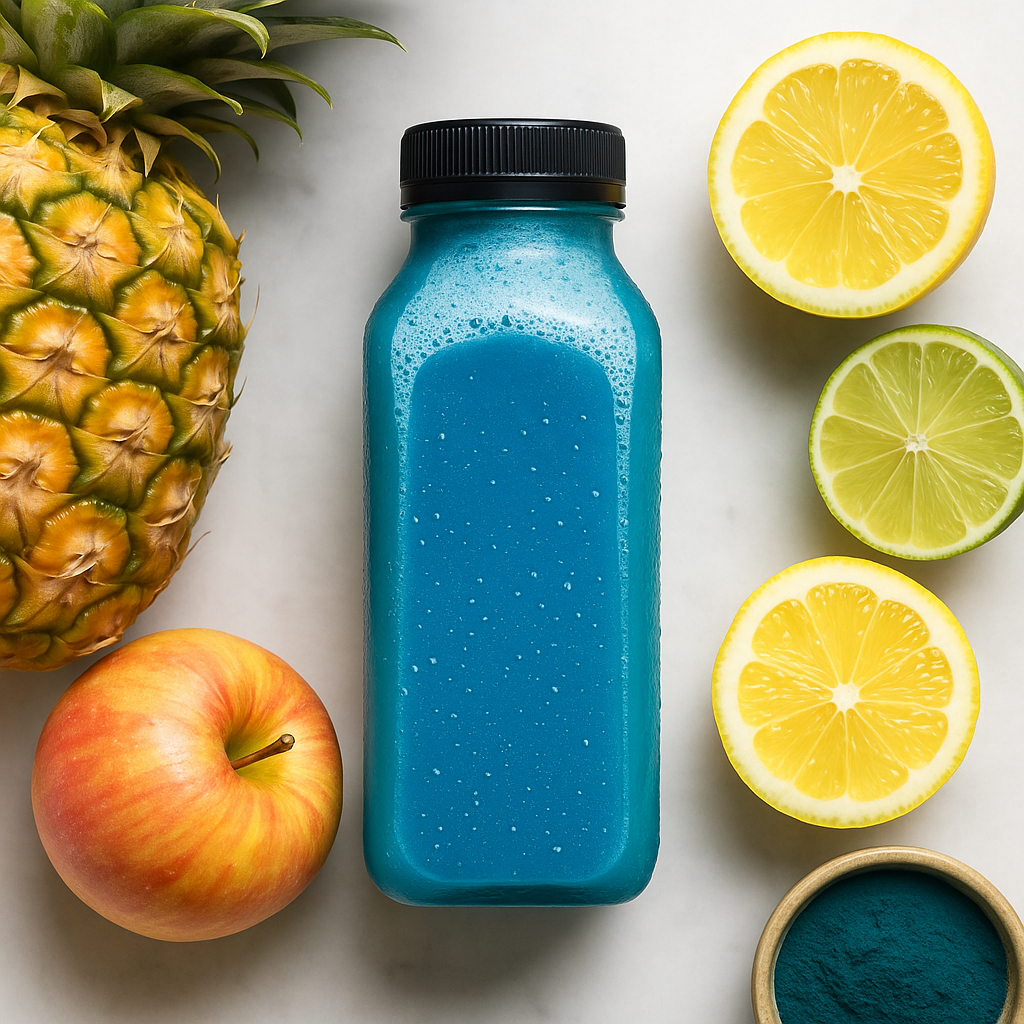 Ocean Glow combines pineapple, apple, lime, lemon, and blue spirulina for a tropical juice that supports radiant skin and energy. It’s your beach day in a bottle, designed to hydrate and restore.